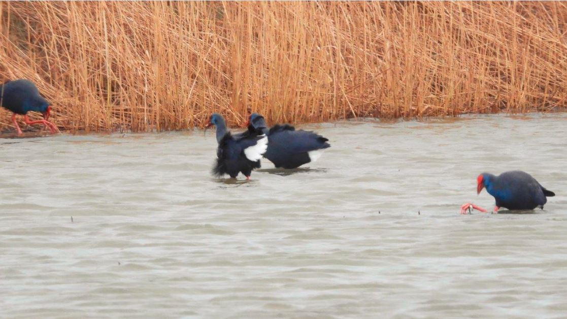 Talèves sultanes (Porphyrio porphyrio) dans le delta de l’Èbre (Catalogne, Espagne) en janvier 2020.