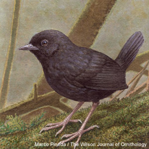Le Mérulaxe de Junín (ou de Getty) (Scytalopus gettyae) a été décrit dans les forêts nébuleuses du centre du Pérou : il n’existerait aucune photo de l’espèce dans la nature !Dessin : Marco Pineda / The Wilson Journal of Ornithology
