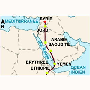 Trajet des trois Ibis chauves suivis par satellite vers leurs quartiers d’hivernage. Point rouge : colonie près de Palmyre en Syrie. Points jaunes : étapes de migration.Carte : Ornithomedia.com, d’après la RSPB