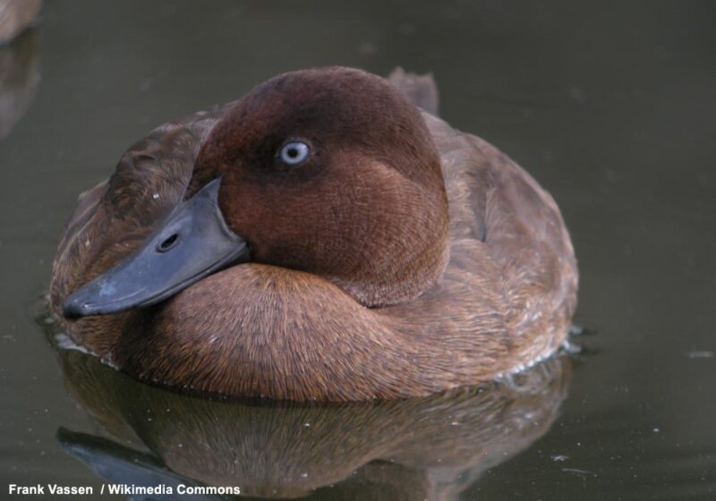 Fuligule de Madagascar (Aythya innotata) mâle de première année élevé en captivité en vue d’être relâché dans la nature. Notez son iris bleu et non pas blanc, comme chez l’adulte.