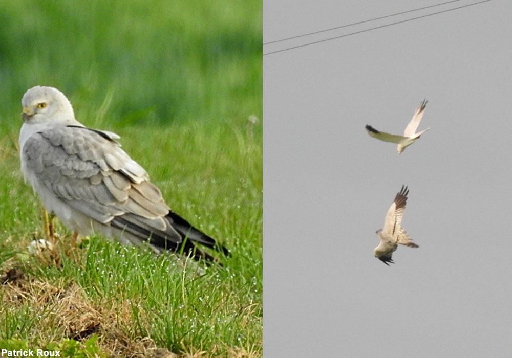 Busard pâle (Circus macrourus) mâle adulte, au sud de Sézanne (Marne), le 2 mai 2020 : il a été vu harcelant un Busard cendré (C. pygargus) mâle (à droite).