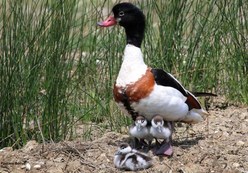 Tadorne de Belon (Tadorna tadorna) femelle et poussins, réserve ornithologique du Teich (Gironde), le 24 mai 2016.