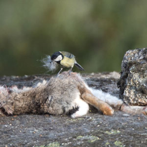 Mésange charbonnière (Parus major) prélevant des poils sur un cadavre de Lapin de Garenne (Oryctolagus cuniculus) en Castille-et-León (Espagne) au printemps 2017.