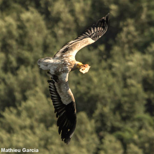 Vautour percnoptère ou Percnoptère d’Égypte (Neophron percnopterus) avec un sandwich dans le bec dans les gorges de l’Ardèche (Ardèche) le 24/07/2016.Photographie : Mathieu Garcia / www.mathieu-garcia.com