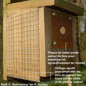 Une plaque de métal autour de l’entrée du nichoir, et du grillage agrafé sur le toit, sur les côtés et sur le plancher constituent des protections efficaces contre les attaques du Pic épeiche.