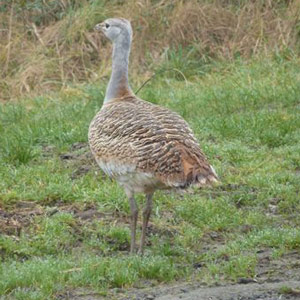 The Great Bustard (Otis tarda) was formerly native in Great Britain, but it was hunted excessively and it disappeared by the 1840s. In 2004, a project of reintroduction began in the Salisbury Plain in Wiltshire with chicks born in the Saratov region in Russia was undertaken by The Great Bustard Group, a Registered Charity that aims to establish a self-sustaining population of Great Bustards in the UK. In 2011, a second releasing site has been chosen in the Wiltshire. More than 100 birds have been released in the country since 2004.Some of these birds, mainly immatures, had undergone movements of several hundred kilometres : since 2005, several birds (more than 10) have crossed the Channel and have been watched in Western France.