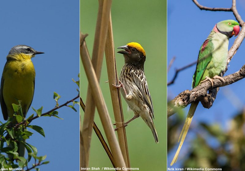 Trois représentants des familles des Motacillidés, des Plocéidés et des Psittaculidés : la Bergeronnette printanière (Motacilla (Budytes) flava), le Tisserin manyar (Ploceus manyar), et la Perruche alexandre (Psittacula (Palaeornis) eupatria).