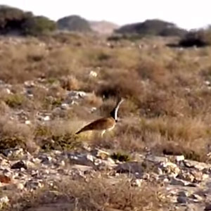 The Houbara Bustard (Chlamydotis undulata) is a typical bird of the desert areas of North Africa. This is a medium-sized species, brown above and white below, with a black stripe on the sides of the neck. In flight, its wings present large black and brown areas. It is a shy and cautious bird that walks from bush to bush to hide when one is approaching. It breeds in arid areas dotted with bushes. The total population of the nominate subspecies (North Africa) is estimated at less than 10,000 birds, the main threats being hunting and disturbance. Olivier Fontaine from the Emirates Center for Wildlife Propagation, presents this species, its status in the Moroccan kingdom and advice to search for it in this country.