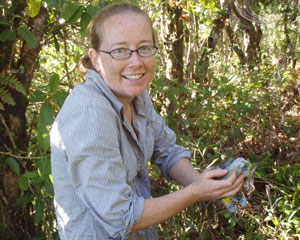 Erica Spotswood lors de son étude du Ptilope de la Société (Ptilinopus purpuratus) en Polynésie française.Photographie : Laura Stephenson