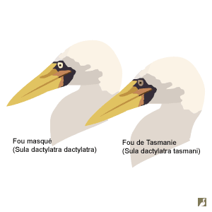 Fous masqué (Sula dactylatra dactylatra) et de Tasmanie (S. d. tasmani) : ce dernier a un iris sépia et a des ailes légèrement plus longues.Schéma : Ornithomedia.com