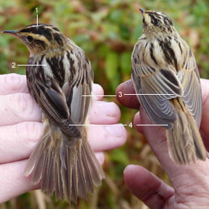Phragmites aquatiques (Acrocephalus paludicola) adulte (gauche) et jeune (droite), marais du Mès (Loire-Atlantique) : notez la bande médiane jaune sur la calotte (1) et les deux bretelles claires (2) sur le dos. L’adulte a un plumage usé, ce qui est particulièrement visible à l’extrémité des rémiges primaires » (4). Les tertiaires du jeune ont des iiserés clairs nets et larges (3) qui sont presque absents chez l’adulte à cause de l’usure.Photographie : Olivier Trépos