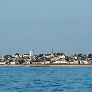 Vue du bourg de Molène (Finistère) depuis le bateau reliant l’île à la ville du Conquet (Finistère).