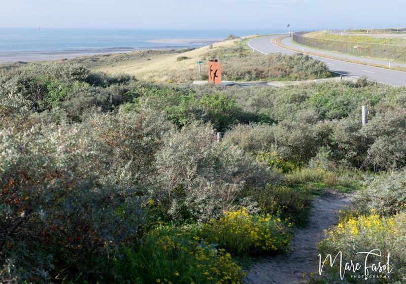 Vue de la digue en partie couverte d’Argousiers (Hippophae rhamnoide) et de la palissade d’observation du Slikke van Voorne, dans le Maasvlakte 2 (Pays-Bas).