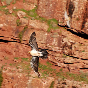 The Bearded Vulture (Gypaetus barbatus) is a very large raptor (wingspan ranging from 245 to 285 cm) with narrow wings and a long wedge-shaped tail. The head and the belly of the adult are of a more or less dark orange. Juveniles and immature are dark brown. The presence of small feathers at the base of the beak explains its name of « bearded ». This raptor lives in areas with steep cliffs with a high density of Ungulates.