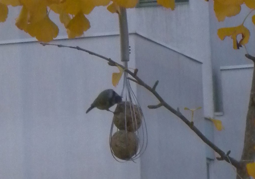 Une astuce simple pour donner des boules de graisse aux oiseaux sans leur filet : les placer dans un fouet de cuisine et suspendre l’ustensile. Cette Mésange bleue (Cyanistes caeruleus) semble bien s’adapter à ce support original.
