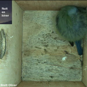 Mésange bleue (Cyanistes caeruleus) dans un nichoir durant une nuit d’hiver (à 22 heures) filmée avec une caméra à infrarouge en Grande-Bretagne. Notez ses plumes gonflées pour mieux conserver la chaleur.