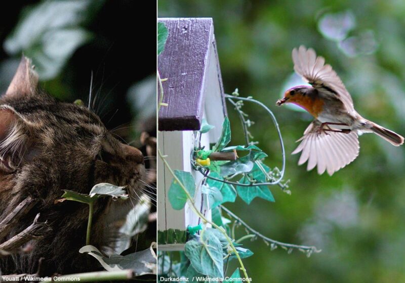 Chat domestique (Felis silvestris catus) et Rougegorge familier (Erithacus rubecula) s’approchant de son nichoir.