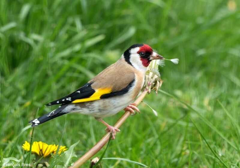 Chardonneret élégant (Carduelis carduelis) se nourrissant de graines de Pissenlit (Taraxacum officinale) à Lasseube (Pyrénées-Atlantiques) le 14 avril 2019.
