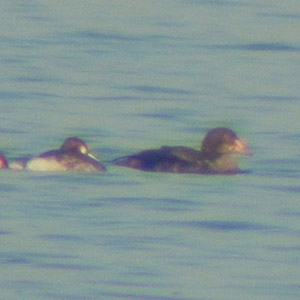 Eider à tête grise (Somateria spectabilis) de premier hiver et Grèbe huppé (Podiceps cristatus) à Villerville (Calvados) le 12 février 2008. Ce jeune eider stationnait loin du rivage et n’était visible qu’avec des jumelles ou une longue-vue.