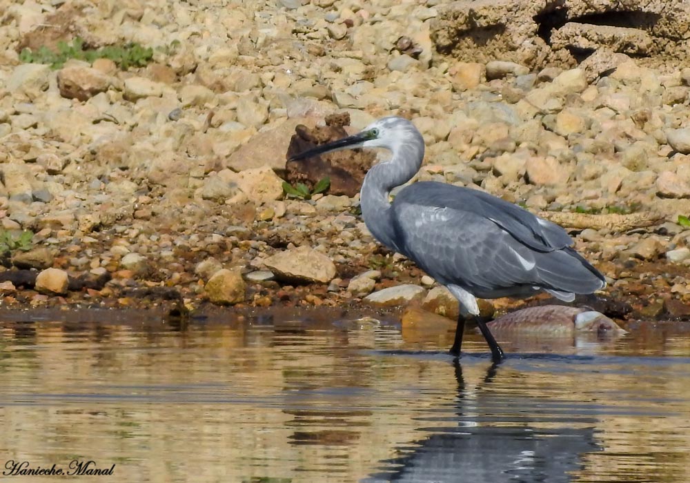 The Western Reef Egret (Egretta gularis) is a tropical species breeding in colonies along the coasts (mangroves, cliffs and sandy islands) from West Africa to the Indian subcontinent through the Middle-East. There are mainly two forms of plumage: a dark, slate gray with a white throat, and a white light very similar to the Little Egret (E. garzetta). The Western Reef Egret is accidental in the Maghreb, its nearest breeding sites being located on the Banc d’Arguin in Mauritania. A dark form bird was found in the Mekhada swamp in Algeria in July 2018, then a probable hybrid Egretta gularis x garzetta, with a white and grey plumage, was discovered the 20th of May 20, 2019 on the shores of the Hammam Grouz reservoir by Hanieche Manal and Soltane Yacine during a birds count. It was found again and photographed by Abdelmalik Bousseta and Hanieche Manal the 30th of October 2019 at the reservoir of Beni Haroun, where it was still present throughout the month of November.