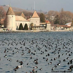 Le lac Léman est le plus grand (582 km²) lac alpin et subalpin d’Europe centrale. Il est situé à l’extrémité ouest de la Suisse et au nord du département français de la Haute-Savoie. Sa forme est celle d’un croissant long de plus de 72 km et large au maximum entre Morges et Amphion de 13,8 km. Il est traversé d’est en ouest par le Rhône, qui sort à Genève avant de couler vers la Méditerranée. C’est l’une des plus importantes zones humides de France (la deuxième après la Camargue) et de Suisse pour l’hivernage des oiseaux aquatiques : de novembre à mars, des centaines de milliers de canards plongeurs et de surface et de grèbes stationnent sur le lac. Parmi les espèces communes, il est possible de découvrir des oiseaux moins fréquents comme la Nette rousse (Netta rufina), le Garrot à œil d’or (Bucephala clangula), le Fuligule nyroca (Aythya nyroca), la Harelde boréale (Clangula hyemalis), l’Eider à duvet (Somateria mollissima), la Macreuse brune (Melanitta fusca), les Harles bièvre (Mergus merganser) et huppé (M. serrator), les Grèbes jougris (Podiceps grisegena) et esclavon (P. auritus) ou encore les plongeons (Gavia sp.). Des oiseaux marins sont même parfois observés (lire Observer les labbes sur le lac Léman).