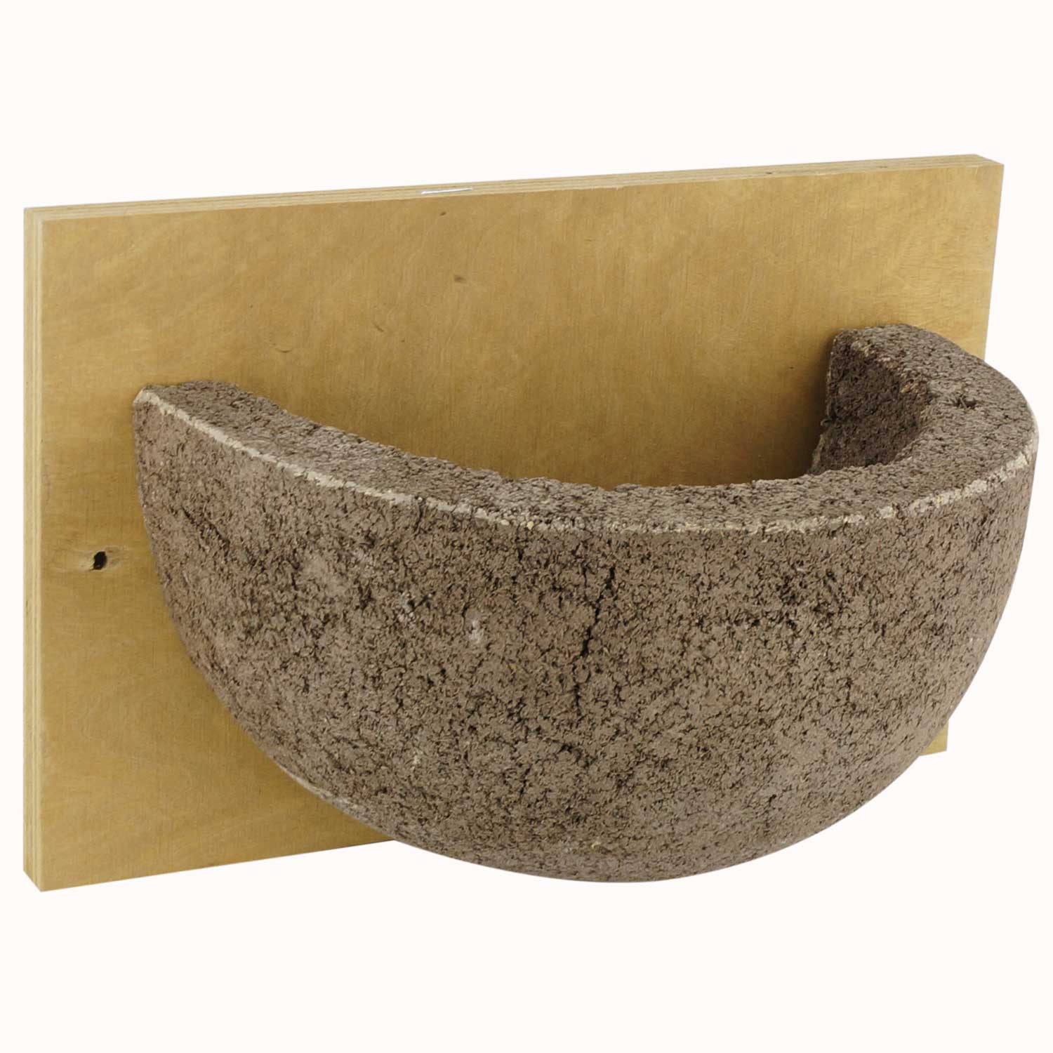 Ce nichoir solide, en béton de bois classé F.S.C. (= issu d’une gestion durable des forêts), reproduit parfaitement la forme du nid des Hirondelles rustiques (Hirundo rustica) et se fixe facilement à l’intérieur d’un bâtiment ouvert.