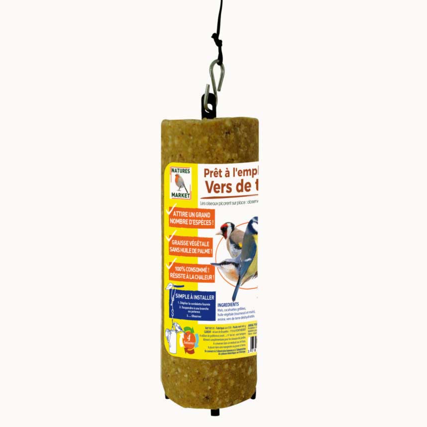 - Composition : graisse végétale + vers, fruits rouges, insectes ou cacahuètes (en fonction des stocks disponibles)