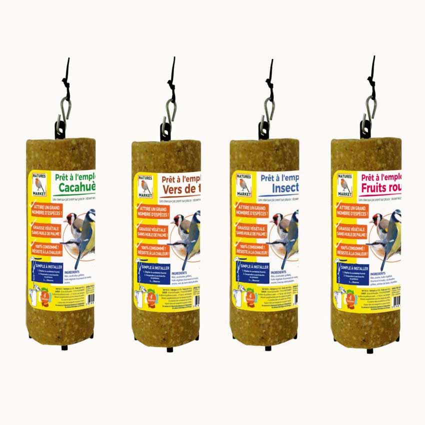 Pour supporter les rigueurs de l’hiver, les oiseaux ont besoin de se constituer des réserves. Il existe sur le marché des boules de matières grasses, mais elles sont généralement d’origine animale, ce qui n’est pas vraiment conforme à leur alimentation naturelle. Ces quatre cylindres de graisse végétale, prêts à être suspendus en attachant une ficelle dans le trou de la tige centrale (nouvelle version livrée), constituent des sources d’énergie complète riches en protéines, glucides et lipides, et attireront une grande variété d’oiseaux du jardin aux besoins alimentaires différents. Quatre saveurs sont disponibles : fruits rouges, cacahuètes, insectes et vers.