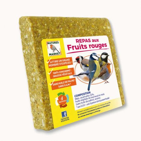 Durant la mauvaise saison, les oiseaux ont plus de mal pour trouver leur nourriture, et nous pouvons donc les aider en leur fournissant une nourriture d’appoint, notamment des graisses, celles d’origine végétale étant préférables. Ce repas de 300 grammes, à base de graisse végétale et à la saveur de fruits rouges, sera apprécié par les espèces frugivores, comme les merles ou les grives, mais pas seulement !
