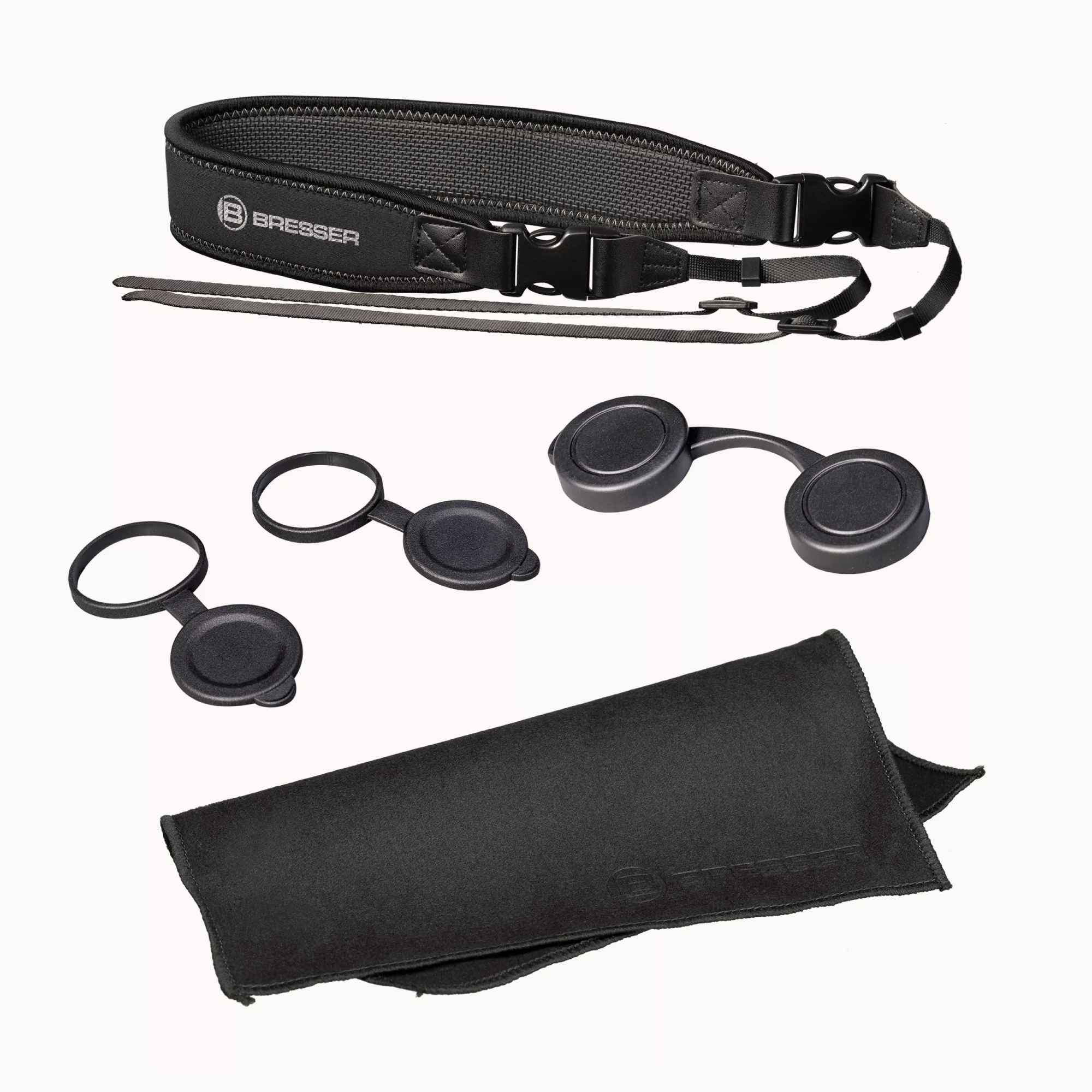 Elles sont fournies avec une sangle de transport large et très confortable, un étui en nylon avec bandoulière, des capuchons d’objectifs et d’oculaires et d’un grand chiffon de nettoyage.