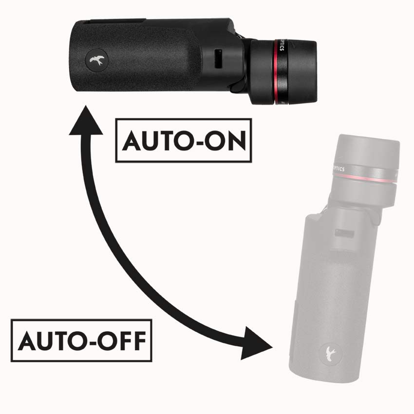 Sans qu’il ne soit nécessaire d’actionner le commutateur marche/arrêt, l’électronique est mise en veille lorsque les jumelles sont en position durable de repos (par exemple quand elles sont suspendues au cou), pour se réactiver automatiquement lorsque vous reprenez les observations (Automatic Power Control). Ce fonctionnement permet de faire des économies d’énergie. Les jumelles Kite APC 12×42 ont ainsi une autonomie potentielle de fonctionnement de 120 heures : elles sont en effet munies de deux compartiments, chacun d’eux accueillant deux piles de type AA standard (Kite déconseille l’usage de piles rechargeables). Le second compartiment sert en fait à stocker les deux piles de rechange, que vous pourrez utiliser après les 60 premières heures d’utilisation.