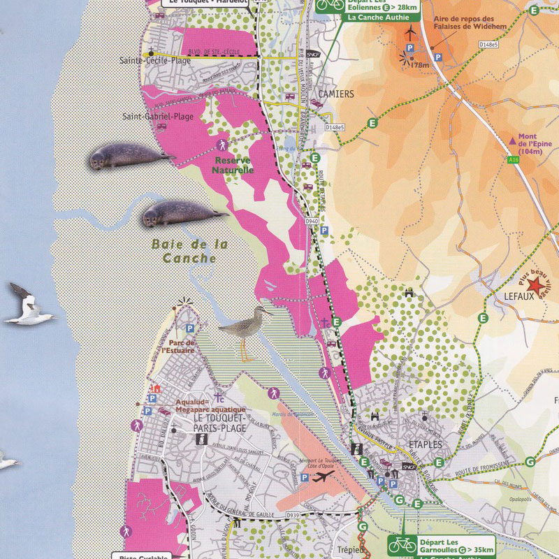 La carte numéro 36 couvre la Côte d’Opale Sud et le Boulonnais, dans le département du Pas-de-Calais, un secteur riche en sites ornithologiques réputés pour l’observation du passage des oiseaux migrateurs terrestres (passereaux sibériens et nordiques), des limicoles et des oiseaux marins (labbes, fous, puffins, etc.). Tous les bons coins sont bien sûr là, comme les caps Blanc-Nez et Gris-Nez, le marais de Wimereux, le port de Boulogne-sur-Mer, le Parc de la Falaise au Portel, les estuaires de la Slack et de la Canche, etc.