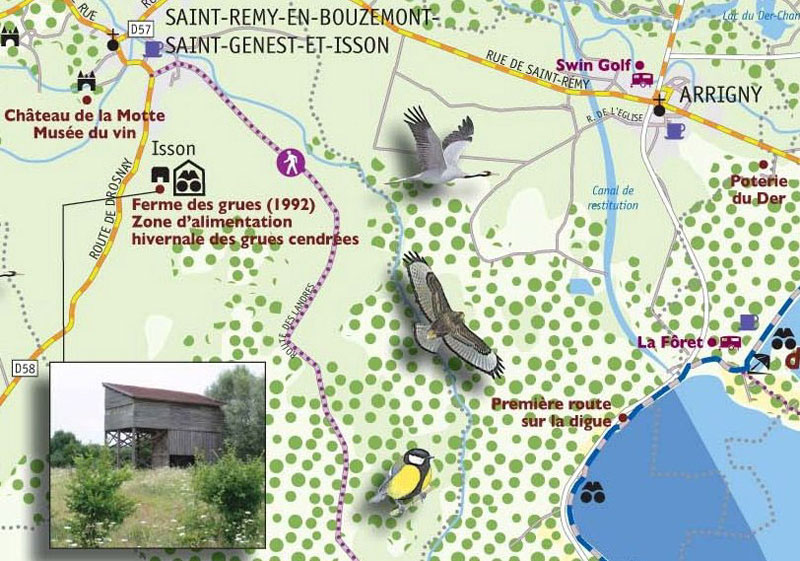 Cette très belle carte colorée peut être utilisée comme carte de promenade, les sentiers étant signalés. Elle indique aussi les meilleurs sites pour observer les oiseaux autour du lac du Der et des lacs aubois (les observatoires et centres d’informations sont placés), les bons trajets à faire en vélo ou à pied, les endroits pour séjourner (campings / hôtels / B & B) et donne des informations sur la migration des Grues cendrées.