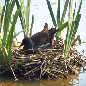 Gallinule poule-d’eau (Gallinula chloropus) sur son nid, Fairlands Valley Park, Stevenage (Grande-Bretagne).Photographie : Anemone Projectors / Wikimedia Commons