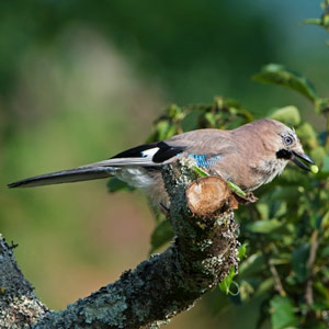Geai des chênes (Garrulus glandarius) avec un gland dans le bec.