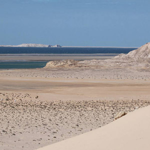 Vue de la colonie Flamants roses (Phoenicopterus roseus) sur la lagune côtière de Khnifiss (Maroc) en juin 2022.