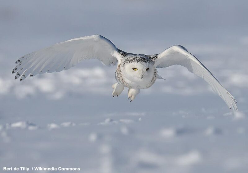 Le Harfang des neiges (Bubo scandiacus) est une grande espèce de la famille des Strigidés (hiboux et chouettes), avec une envergure de 170 à 177 cm pour la femelle adulte et de 160 à 170 cm pour le mâle adulte (lire Pourquoi les femelles de rapaces sont-elles généralement plus grandes que les mâles ?). Le mâle adulte est d’un blanc presque pur (son plumage blanchit avec l’âge), alors que la femelle et l’immature sont plus ou moins tachetés ou barrés de brun. En outre, le plumage est plus foncé au printemps et en été qu’en hiver. Ses yeux sont jaune vif. Il se reproduit dans la toundra arctique, de l’Alaska à la Sibérie en passant par le Canada, le Groenland et la Scandinavie. Il chasse principalement les lemmings, des petits rongeurs dont l’abondance détermine le succès de sa reproduction (la taille de sa couvée diminue quand il y a moins de proies).