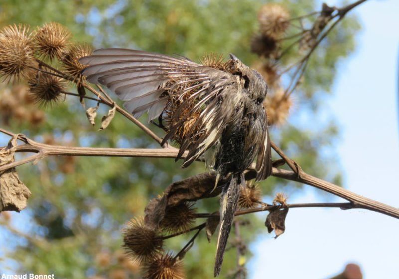 Des oiseaux peuvent se retrouver accrochés ou collés sur certaines plantes : le 8 octobre 2020, Arnaud Bonnet a trouvé en Haute-Garonne un cadavre de Gobemouche noir fixé aux crochets des capitules d'une Grande Bardane.