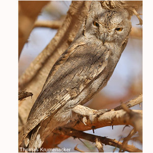 Petit-duc de Bruce (Otus brucei) dans le sud d’Israël en mars 2013.Photographie : Thomas Krumenacker / Krumenacker.de
