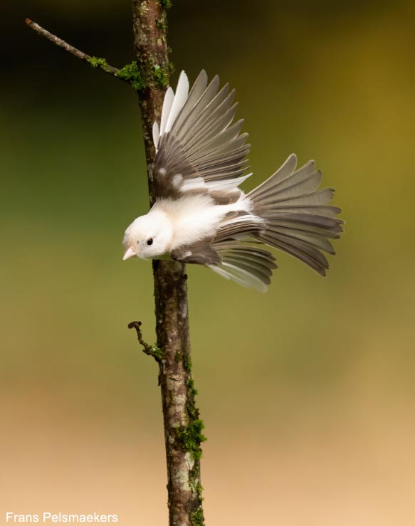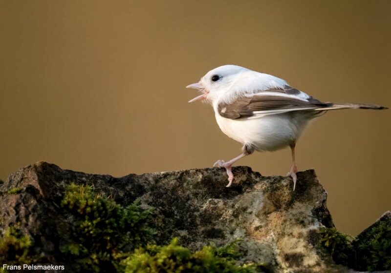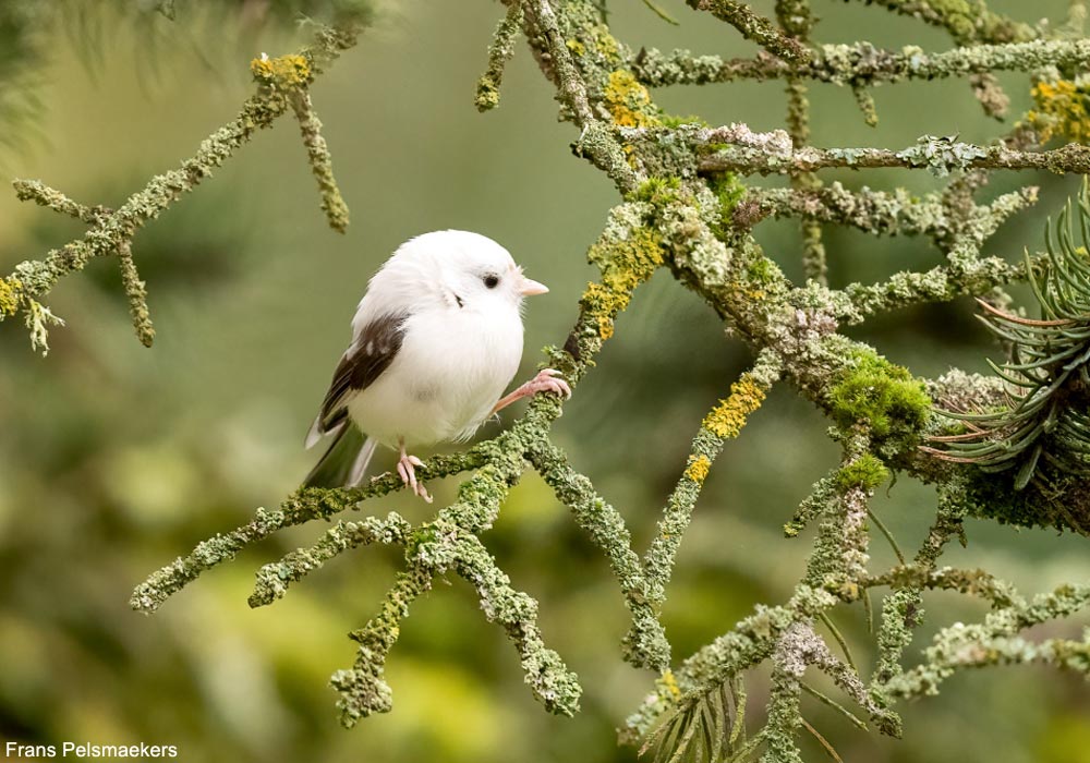 La Mésange nonnette (Poecile palustris) est une espèce forestière présente partout en France, où elle est commune. Elle a les parties supérieures brunes et les parties inférieures blanchâtres plus ou moins teintées de chamois, surtout aux flancs, et elle a une calotte et une bavette noires (lire Distinguer les Mésanges nonnette et boréale). En novembre et en décembre 2024, Frans Pelsmaekers a observé et photographié à Hautvillers (Marne) une Mésange nonnette au corps (tête, dos et parties inférieures) entièrement blanc, aux ailes brunes parsemées de quelques grandes couvertures, rémiges primaires et secondaires blanches, à la queue brune et au bec et aux pattes roses.
