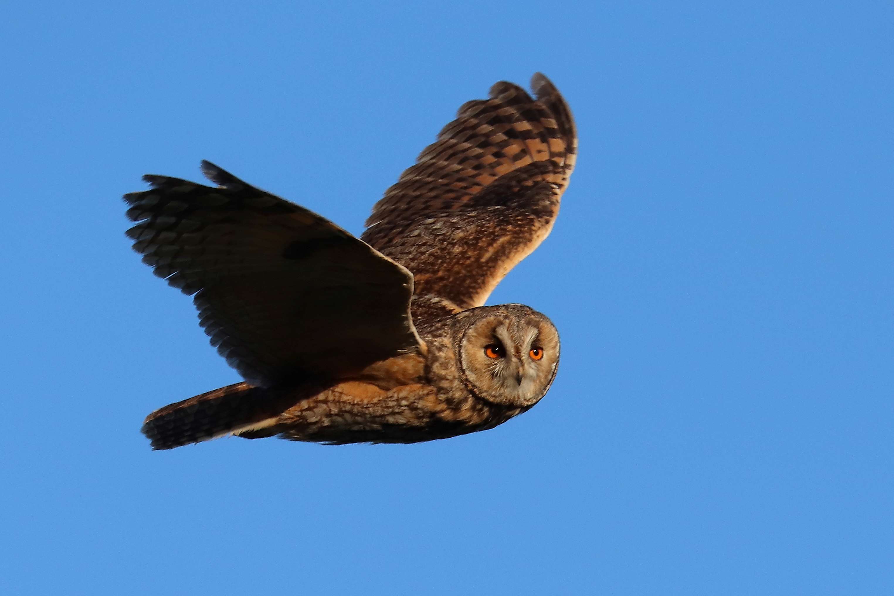 Photo prise le 30/05/2020 : quand on se lève tôt, on est récompensé ! Notez certains des critères permettant de distinguer les Hiboux moyen-duc et des marais (Asio otus) en vol. Chez le Hibou moyen-duc, les yeux sont orange et non pas jaunes, la face est plus sombre, les ailes sont plus courtes et plus larges, sans bordure pâle à l'arrière et au dessin différent à leur extrémité supérieure, le ventre est plus sombre et davantage strié et les barres sombres sur la queue sont plus fines.