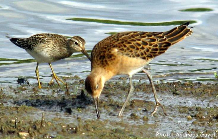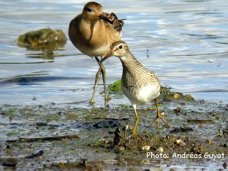 Photo prise le 10/09 par Andrés Guyot (blog : Oiseaux des Pyrénées). Oiseau de première année. Espèce accidentelle rare originaire d'Amérique du Nord et du nord-est de la Sibérie. Par son long cou et la forme de son bec, il fait penser à un petit Combattant varié (Philomachus pugnax, dont un jeune est justement aussi visible sur la photo. Notez le bec assez court et légèrement arqué à base jaune, la poitrine striée et le ventre blanc, le dessus écailleux noir et roux avec une nette bande blanche, le sourcil net et les pattes jaunâtres.