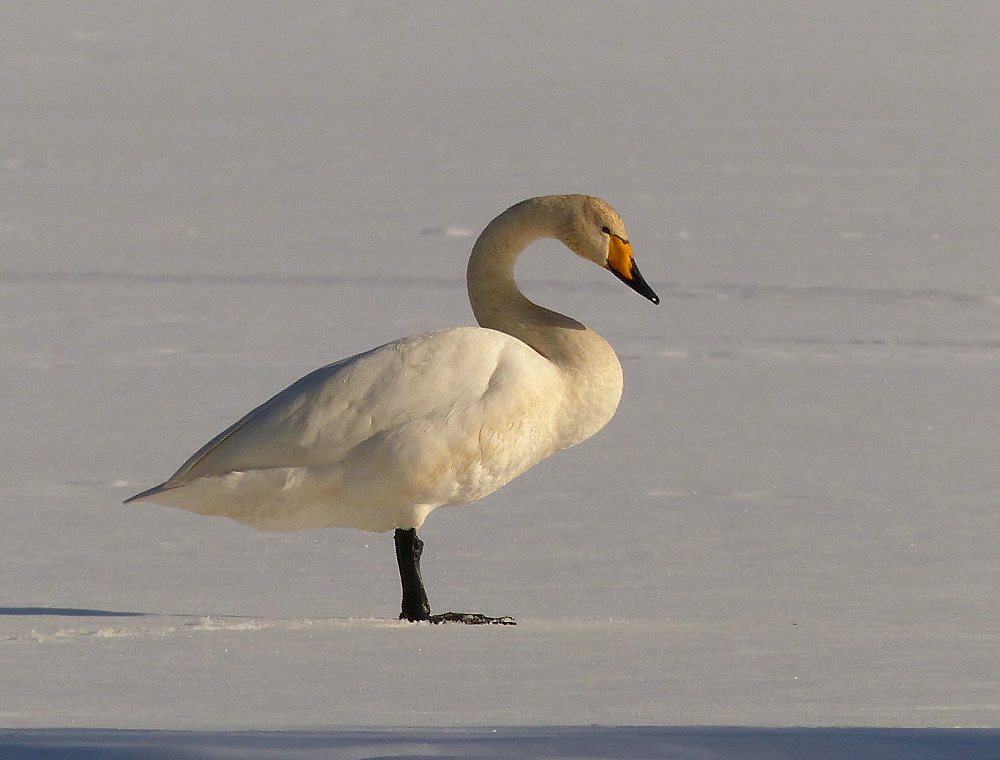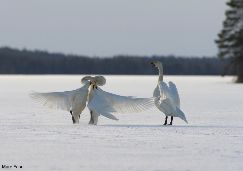 Photo prise le 25/03/2017. Tout juste arrivé de migration, un couple de Cygnes chanteurs sur la glace du lac Niilesjärvi. Lire Observer les oiseaux dans les environs d'Oulu (Finlande).