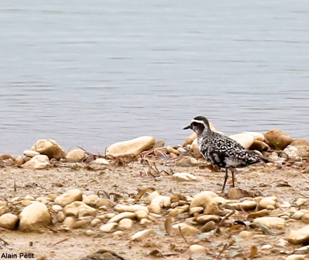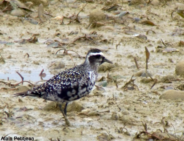 Adulte en mue découvert le 16/09 par Thierry Petit et toujours présent le 23/09 au moins. Espèce nord-américaine accidentelle en Europe de l'Ouest. Il se distingue du Pluvier doré par la forme plus élancée, les ailes plus longues et plus étroites, les aisselles grises et non pas blanches (critère visible en vol), les sous-caudales noires et non pas blanches, et le dessus plus fortement tacheté de noir. Il se distingue du Pluvier fauve par sa plus longue projection primaire et ses ailes plus longues (lire Distinguer les Pluviers fauve et doré adultes en plumage nuptial ).