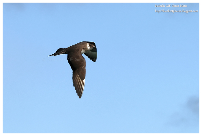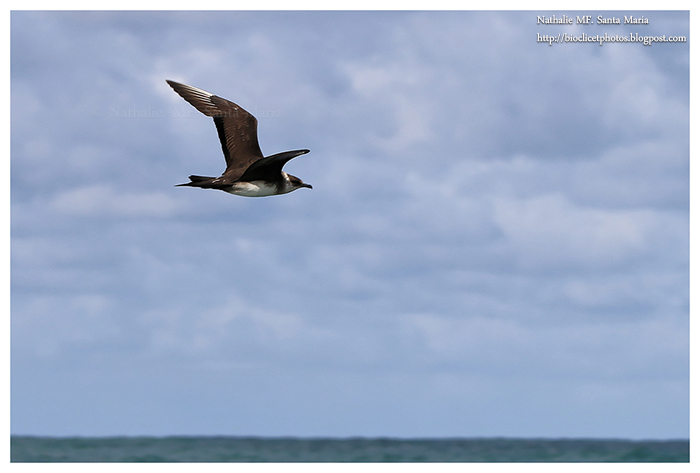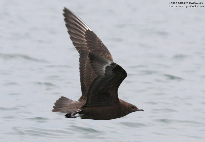 Photo de Joël Bruezière (site web : Eyesonsky.com) prise le 09/09/2005. Lire Observer les labbes sur le lac Léman et Identifier les Labbes à longue queue, parasite et pomarin juvéniles en vol. Il s'agit d'un oiseau de forme sombre (lire La phase des oiseaux, un terme à bannir ?).