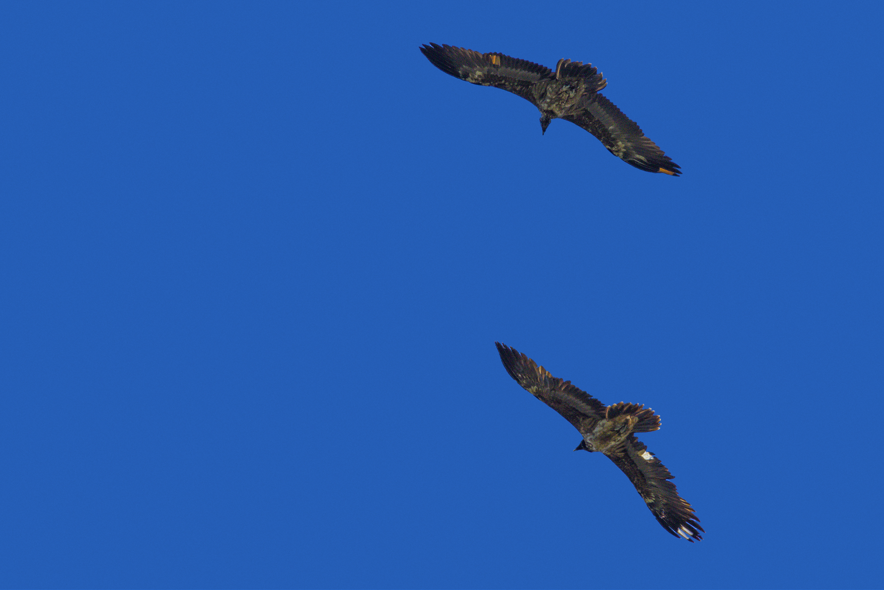 Photo prise le 08/07/2024. Un 3éme Gypaète barbu de 1ère année au marquage différent près du centre de réintroduction de Salvinsac. Il y aavit peut-être un oiseau de seconde année.