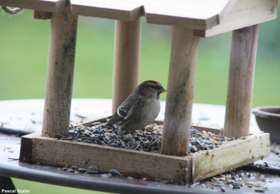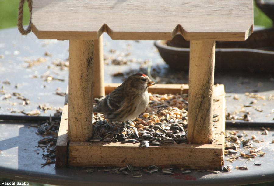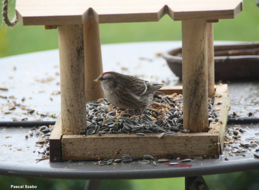 Photographie prise par Pascal Szabo le 04/02. Peu farouche, il visite cette mangeoire depuis le 18 janvier 2018. Un afflux de Sizerins flammés et cabarets est noté en France depuis l'automne 2017. Notez les teintes "froides", alors que le Sizerin cabaret est plus nettement chamois. Les barres alaires balnches sont plus visibles également. Lire Distinguer les Sizerins cabaret et flammé.