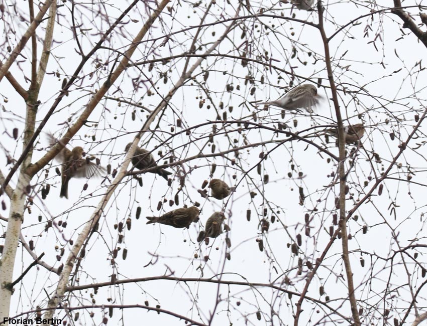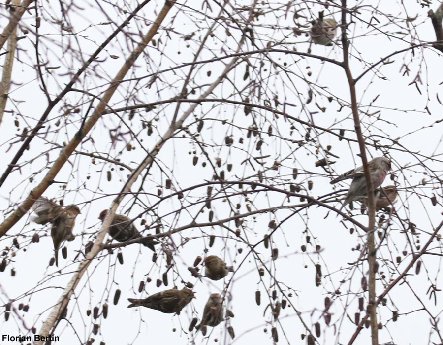 Photographie prise par Florian Bertin (voir sa page Facebook) le 04/02. Observation d'un groupe de 48 sizerins, dont deux Sizerins flammés. Lire Distinguer les Sizerins cabaret et flammé.