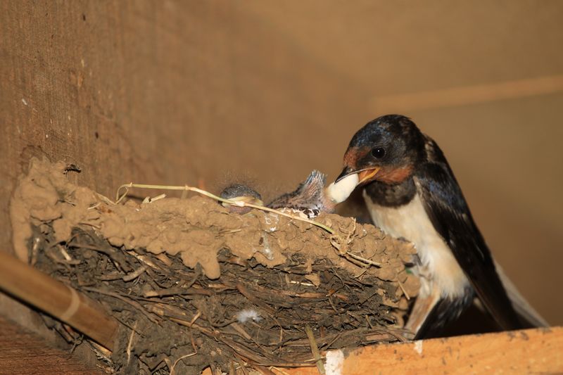 Couple d’hirondelles rustiques et jeunes hirondelles dans leur nid