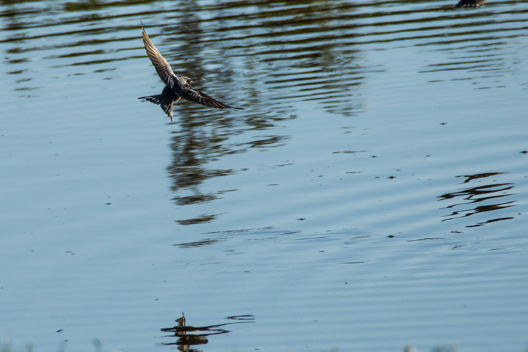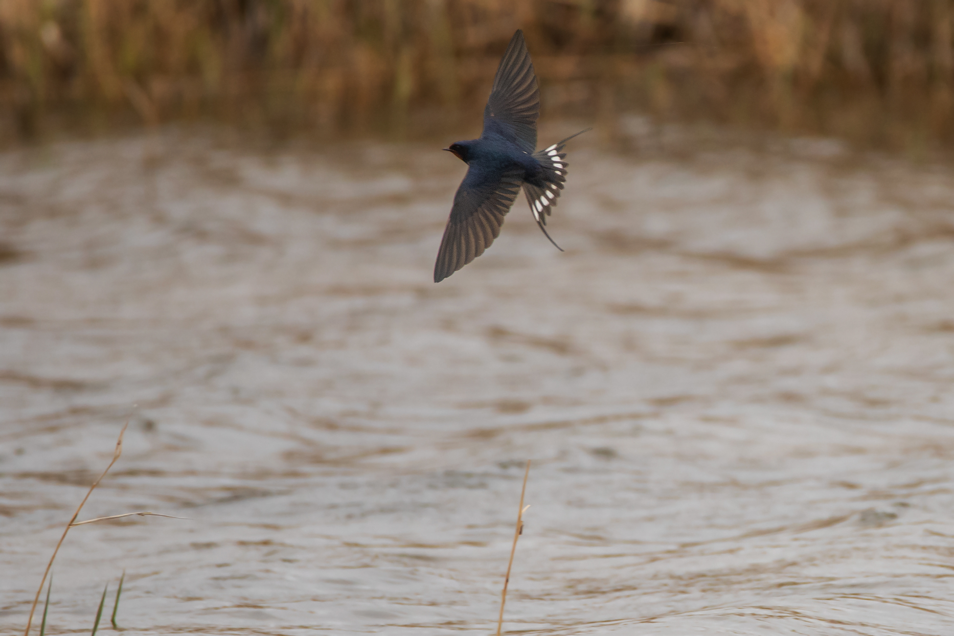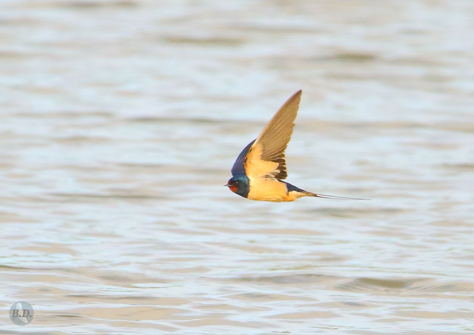 Photo prise le 15/04/2022. Cette Hirondelle rustique s'abreuvait en vol, recueillant l'eau dans sa bouche ouverte en volant à ras de l'eau.